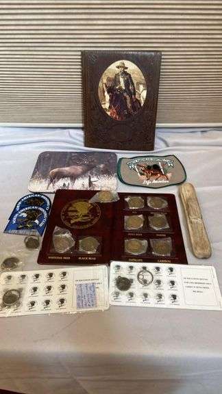 North American Hunting Club Life Member Collectors Set with Coins and Patch, included items: Life Member patch, collectible wildlife coins, key tag, patches, wooden item, historical booklet, likely 1980s-1990s.