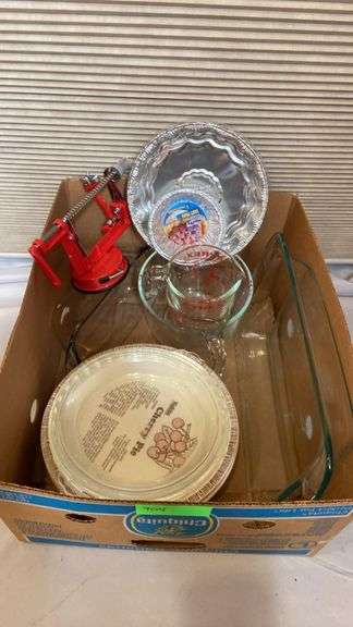 This Pyrex Kitchen and Baking Set includes a glass baking dish, a Cherry pie plate, aluminum pie tins, a Pyrex measuring cup, and an apple peeler, Dimensions of Baking Dish: 13x9x2 inches (33x23x5 cm), Capacity of Measuring Cup: 2 cups, 16 ounces (473 ml), Material of Baking Dish: Glass.