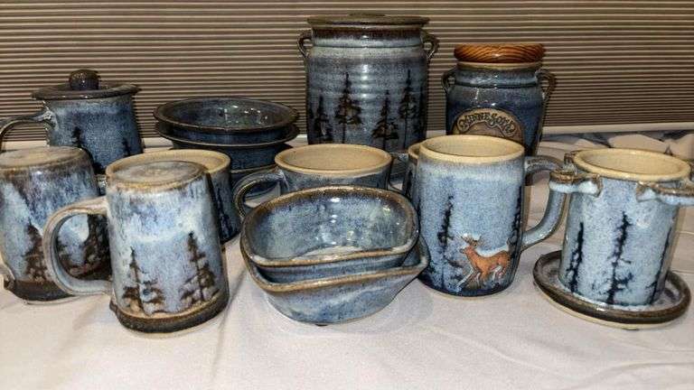 Ceramic Pottery Set with Woodland Design, includes approximately 12 pieces, blue with dark tree pattern, featuring cups, bowls, and containers, intended for dining and serving, signature present on bottom.