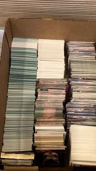 Explore a large collection of MLB sports trading cards, featuring various players and teams including the Cardinals, Cubs, Pirates, Red Sox, estimated several hundred cards, packaged in a repurposed vodka box.