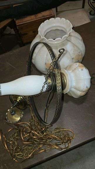 Vintage hanging lamp chandelier, featuring glass and metal construction, white with gold floral design, vintage style, likely incandescent bulb type, estimated chain length 3-5 feet, estimated mid 20th century.