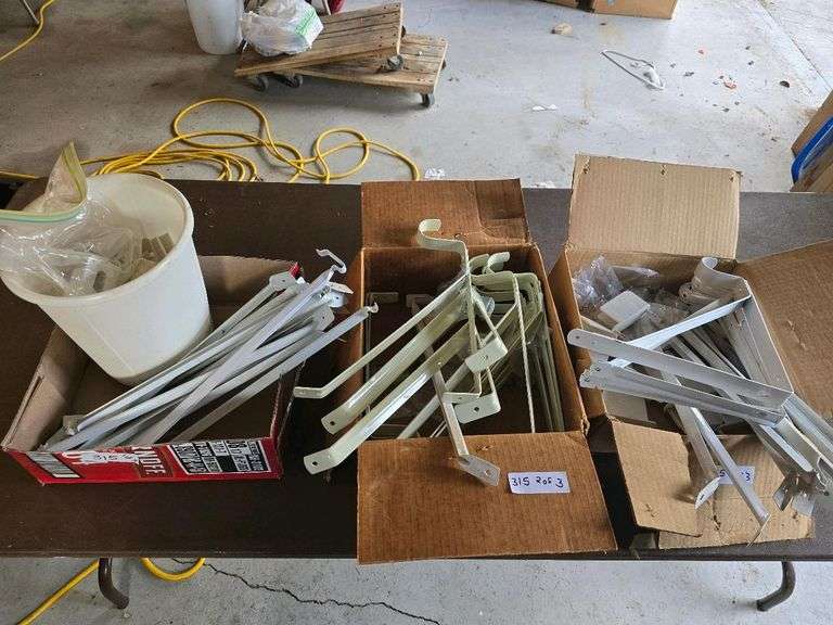 These are metal shelf brackets available in white and beige, suitable for wall mounting, includes mounting hardware, approximate length 10-12 inches, typical load capacity 50-75 lbs per pair, Serial No. 35643, 35642.