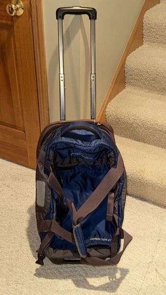 Eddie Bauer Expedition 21 Rolling Backpack, featuring a telescoping handle, backpack straps, and wheels, color blue, estimated capacity 21 liters, approximate dimensions 21" x 14" x 9" (53 cm x 36 cm x 23 cm), likely nylon material, approximate weight 6 lbs (2.7 kg).