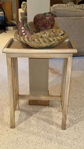 Rustic side table with decorative bowl and faux fruit, dimensions 19"x12"x27", material wood (table), ceramic or composite (bowl and fruit), color whitewash (table) and multicolor (bowl and fruit), style rustic or farmhouse, decorative elements include faux fruit arrangement.