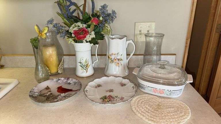 A set of ceramic and glass kitchenware featuring decorative plates, pitchers, and bakeware, floral patterns, bird illustration.