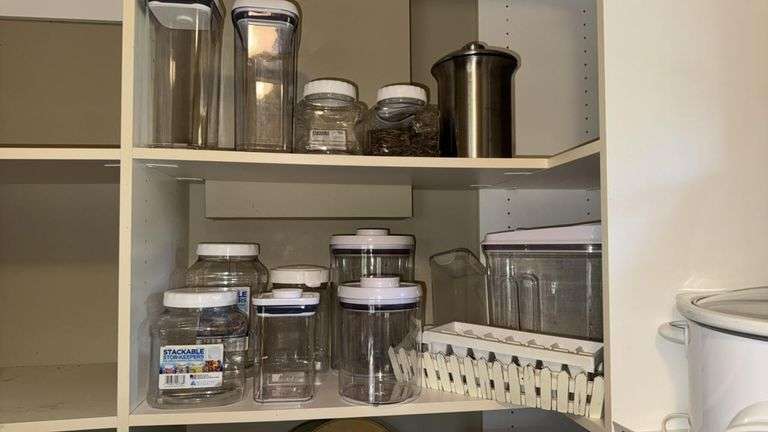 Stackable Kitchen Storage Containers, clear with white lids, BPA-free plastic, ranges from 0.5 qt to 4 qt, airtight snap-on lid.