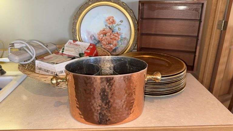 Copper Wine Chiller with Brass Handles, Dual Compartments, Hammered copper finish, Approx. 9 inches diameter (22.86 cm), Holds two wine bottles.