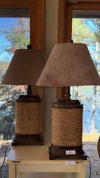 Pair of 33" Table Lamps with Woven Material and Wooden Accents, tapered fabric shade, corded electric, standard E26 socket, rotary switch on socket, pair of matching lamps.