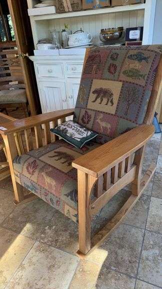 Rustic Wooden Rocking Chair with Nature-Themed Upholstery, material: wood, dimensions: approximately 36 x 26 x 42 inches (91 x 66 x 107 cm), weight: approximately 30 lbs (13.6 kg), high back with armrests, decorative patterned fabric.
