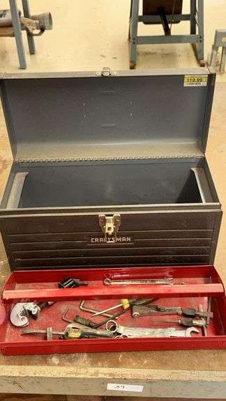 Craftsman Metal Toolbox with Tools, Grey, Removable Tray, material: metal, dimensions: approx. 20 in x 8.5 in x 9.5 in (50.8 cm x 21.6 cm x 24.1 cm), locking mechanism: padlock compatible latch, included tools: wrenches, screwdrivers, miscellaneous small tools.