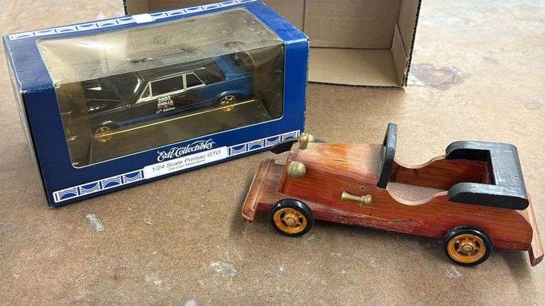 1/24 Scale Ertl Pontiac GTO Die-Cast Metal Bank in Original Box, Material: Die-Cast Metal, Color: Blue, includes wooden car