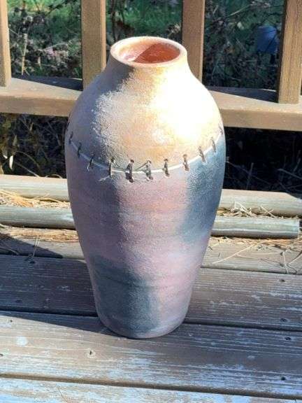 Measures 17 inches tall by 8 1/2 inches wide by 4 inch opening. Clay.