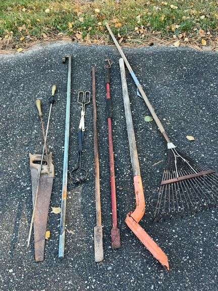 Includes rake, spade, ice chippers. Also includes two pointed rods with brass ends on them, perhaps used for fire sticks