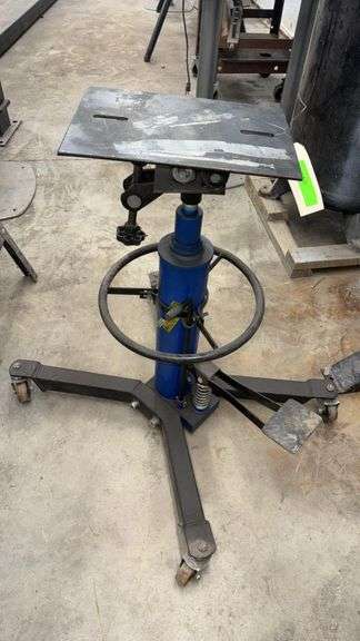 1 Ton Transmission Jack, adjustable saddle, 4 caster wheels, lift range typically 8-24 inches (20-60 cm), base size typically 32x32 inches (81x81 cm), steel construction, made in China.