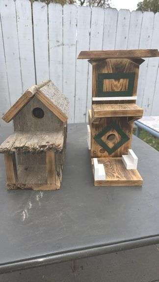 Wooden birdhouses, rustic design, dual levels on one, freestanding, suitable for small bird species, entrance hole approx. 1.5 inches, estimated dimensions 10 x 7 x 15 inches (25.4 x 17.8 x 38.1 cm), estimated weight 2 lbs (0.9 kg).