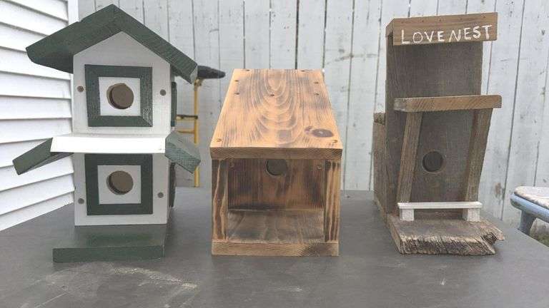 Set of 3 Handcrafted Wooden Birdhouses, includes green and white two-story birdhouse, wooden box birdhouse, rustic 'Love Nest' birdhouse, entrance hole diameter approximately 1.5 inches, dimensions (L x W x H) approximately 8 x 8 x 16 inches for the first two, 8 x 6 x 12 inches for the 'Love Nest.'
