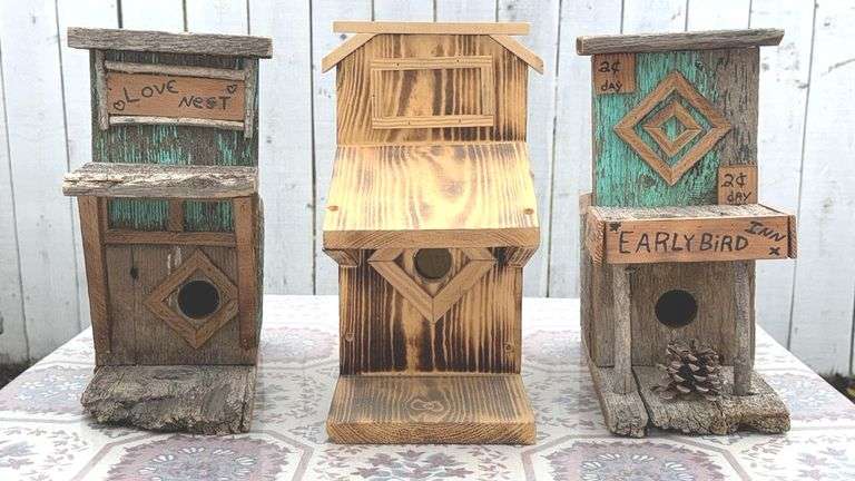 Introducing handcrafted wooden birdhouses with unique designs, made from reclaimed and new wood, natural wood with painted accents, entrance hole approx. 1.5 in diameter, freestanding or wall-mount, special features include names like "Love Nest" and "Early Bird Inn", visible weathering on some birdhouses.