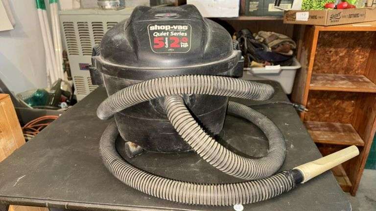Shop-Vac Quiet Series Wet/Dry Vacuum, featuring 5.2 peak HP, approximately 12-gallon capacity, hose length about 6 feet, standard cartridge filter, black color, includes hose with nozzle.