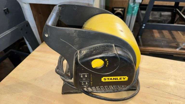 Stanley Electric Fan/Blower, 3 speed settings, electric power source, approximately 1200 Watts, airflow capacity around 250-300 CFM, noise level estimated at 70-80 dB, dimensions approximately 12 x 10 x 8 inches, weight about 7 lbs, cord length 6-8 feet, plastic construction with carry handle.