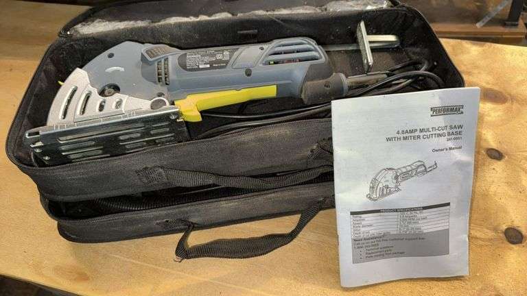 Performax 4.8 Amp Multi-Cut Saw with Miter Cutting Base, Model 241-0951, Corded Electric, 120V, Blade Size 3-3/8 inches, Maximum Cutting Depth 1 inch, Includes Multiple Blades, Carrying Case.