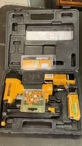 Bostitch SB-1850BN Pneumatic Brad Nailer, featuring a fastener range of 5/8"-2", includes nails, brads, and a hard plastic carrying case, operating pressure 70-120 PSI, magazine capacity 100 nails, tool-free depth adjustment, rear exhaust.