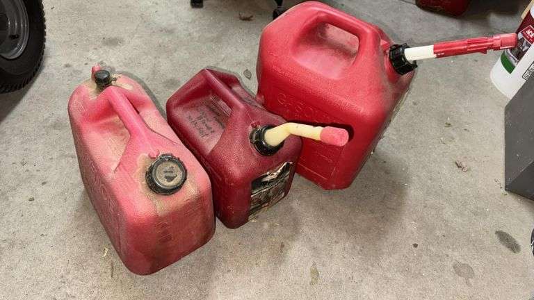 Briggs & Stratton Smart-Fill Gas Can set, includes a variety of capacities from 1 to 5 gallons, plastic construction, Smart-Fill Fuel Filling System, red color, visible dirt and wear.