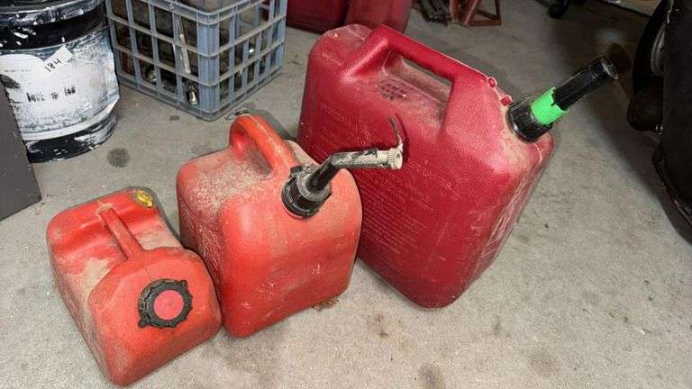 Set of 3 red plastic gasoline cans each featuring a flexible spout, capacities approximately 1 gallon, 2 gallons, and 5 gallons, likely compliant with U.S. EPA and CARB regulations.