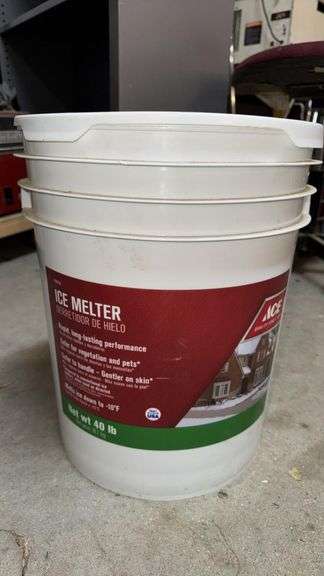 ACE Ice Melter, 40 lbs, fast-acting, long-lasting performance, safer to handle, typically contains sodium chloride or magnesium chloride, standard 5-gallon bucket.