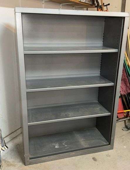 Metal Shelving Unit, dimensions 55"x36"x15" (139.7 cm x 91.44 cm x 38.1 cm), 4 adjustable shelves, open shelves, gray color, weight capacity per shelf approximately 150 lbs (68 kg), overall weight around 50 lbs (22.68 kg).