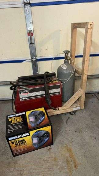 Century Professional Wire Feed Welder, Chicago Electric Auto-Darkening Welding Helmet with Blue Flame Design, CO2 gas cylinder, electric power source, input voltage 120V, output range 30-90 Amps, duty cycle 20% @ 90 Amps.