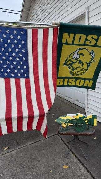 American Flag & NDSU Bison Flag with Metal Wall Art, Fabric and Metal Material, Red, White, Blue, Green, Yellow, Grommets for Hanging.