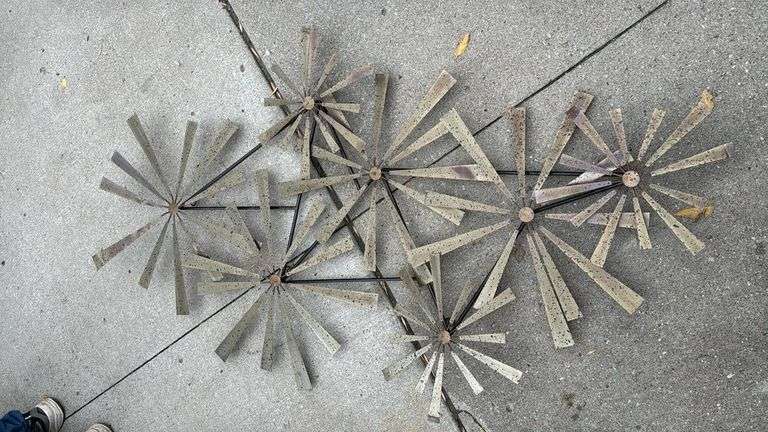 Metal wall sculpture, metal material, rusty/weathered metallic finish, abstract flower/starburst pattern, suitable for outdoor or indoor use.