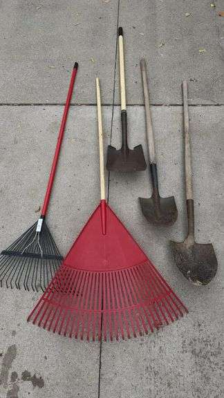 This garden tools set includes a red plastic leaf rake, a metal leaf rake, a flat shovel, and two round shovels, Material: Plastic, Metal, and Wood, Handle Length: Rakes approx. 60 inches (152 cm), Shovels approx. 48 inches (122 cm), Color: Red, Black, Wood, and Metal.