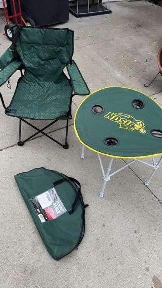 Folding Outdoor Table and Chair Set, Green with Yellow Trim (Table) and Green (Chair), Polyester Fabric and Steel Frame, Approx. Chair Dimensions 34" x 20" x 20", Table Diameter 24", Features Cup Holders, Includes Carrying Bag.