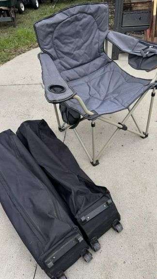 2 Folding camping chairs, cup holder, storage pocket, carry bags with wheels, steel frame, gray color, polyester fabric.
