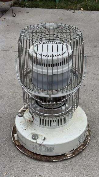 Toyotomi Kero-Sun Omni 105 Kerosene Heater, 23,000 BTU, fuel type: kerosene, approximate dimensions: 27 in (H) x 18 in (W), weight: 25 lbs, color: white, ignition type: manual, safety features: automatic shut-off, tip-over switch, tank capacity: 1.9 gallons, burn time: up to 12 hours. Serial: 02743 D0590A.