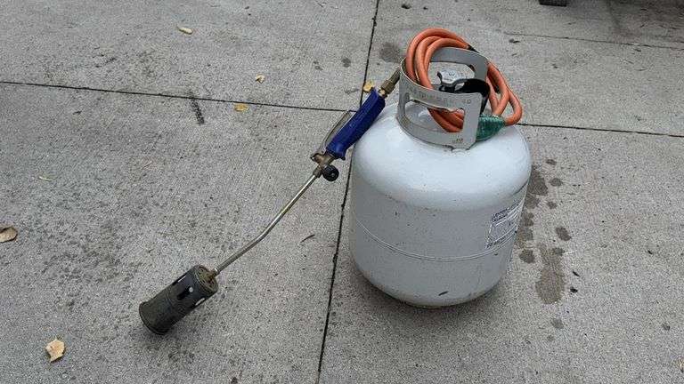Propane Torch Kit with 20 lb Tank, Manual Ignition, 6 ft Hose, torch length 3 feet, maximum temperature up to 3,600 °F, approximate burn time 7-8 hours, dimensions 18 x 12 x 12 inches, weight approximately 32 lbs.