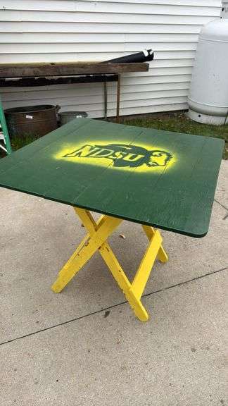 Folding Wooden Table with NDSU Logo, Green & Yellow, made of wood with a painted green tabletop and yellow legs, featuring a North Dakota State University (NDSU) logo, foldable design for easy storage and transportation.