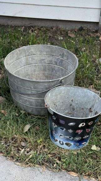 Metal Buckets, galvanized metal, metal wire handles, decorated with NFL team logos, approx. 3 gallons for smaller bucket, 5 gallons for larger bucket, dimensions: small bucket approx. 9 in x 10 in, large bucket approx. 11 in x 13 in.
