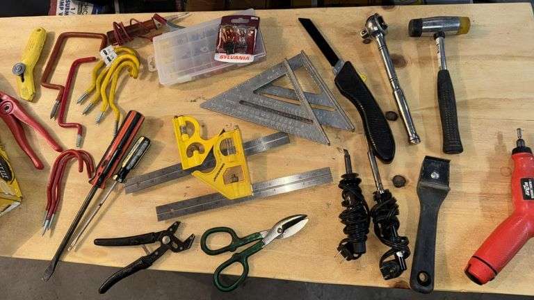 Assorted Hand Tools, includes scissors, square rulers, screwdrivers, ratchet, snips, hand saw, various hooks, screws, bolts, metal and plastic components, approximate dimensions 12 inches (30 cm) for the largest tool, total weight approx. 10 lbs (4.5 kg). Brands include Stanley, Husky, Swanson.