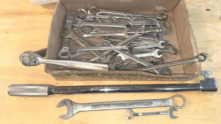 This mixed brand wrench set includes various sizes, steel construction, additional tools such as a ratchet and extension bar, Make: Various (e.g., Craftsman, Thorsen), Weight: Approximately 5 lbs (2.27 kg), Dimensions: Approximately 12 in x 8 in x 4 in (30.48 cm x 20.32 cm x 10.16 cm), Country of Manufacture: USA.