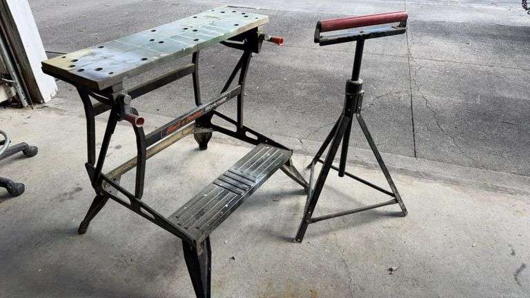 Presenting a versatile Workmate Roller Stand and Folding Workbench, perfect for various tasks with its black and red metal and wood construction, adjustable roller stand, folding step, maximum load capacity of approx. 250 lbs, adjustable height range of 29 to 41 inches, dimensions of 24 x 30 x 60 inches, weight of approx. 30 lbs.