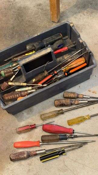 Mixed set of approximately 15 screwdrivers, various handle materials and colors, mixed tip types (flathead, Phillips), includes plastic toolbox.