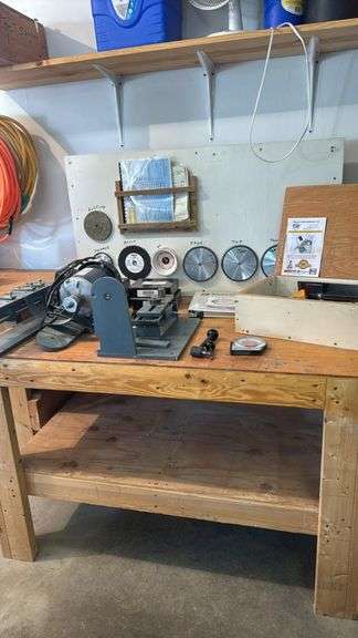 Thorvie AV-40 Saw and Tool Grinder, featuring a 1/2 HP motor and 110V power, electric corded, with included accessories such as the instruction book, various grinding attachments, a magnetic base, and adjustment tools, Serial No. 09130614.