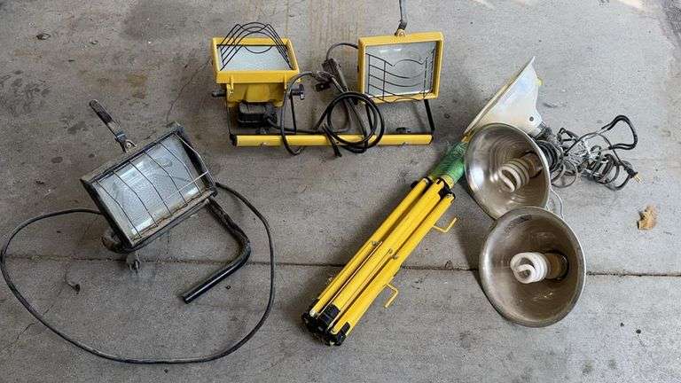Portable Work Lights with Stand, 5 Lights, Yellow & Black, Halogen and CFL bulbs, Electric (Corded) power source, Metal and Plastic construction, Stand included, typically 500W to 1000W, approximately 8,000 to 10,000 lumens, commonly 4 to 6 ft adjustable height, typically 6 ft cord length.