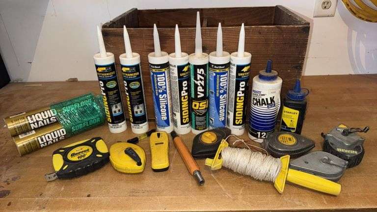 Includes measures, chalk line reels, utility knife, twine, subfloor adhesive, SidingPro 100% Silicone, VP275, DAP 100% silicone, Liquid Nails Subfloor, chalk line reel length typically 100 ft, estimated total weight 10-15 lbs.