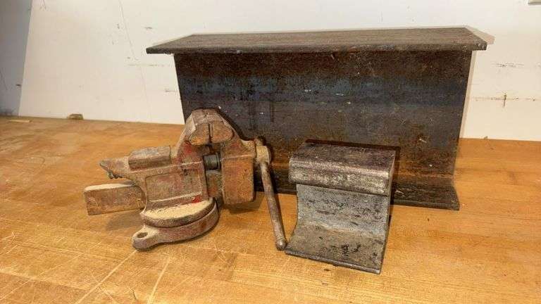 This bench vise features a swivel base, cast iron construction, typical throat depth around 2 inches, weighing approximately 15 lbs. Ideal for bolted mounting.