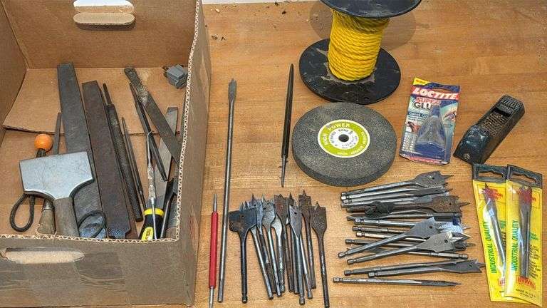 This set includes an assortment of tools such as drill bits, spade bits, files, a rope spool, a grinding wheel, and Loctite glue, providing a variety of applications for different projects. Ideal for woodworking and general repair tasks.