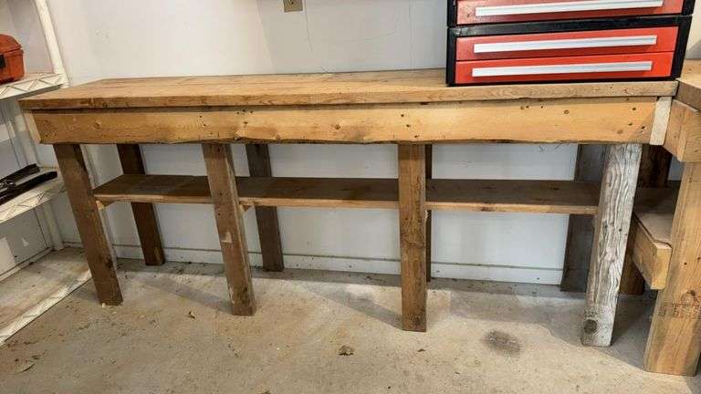 Wooden Workbench, 84"x19"x36", 1 Shelf, DIY/Custom Build, estimated weight 100 lbs (45.36 kg), estimated load capacity 500 lbs (226.8 kg), material: wood.
