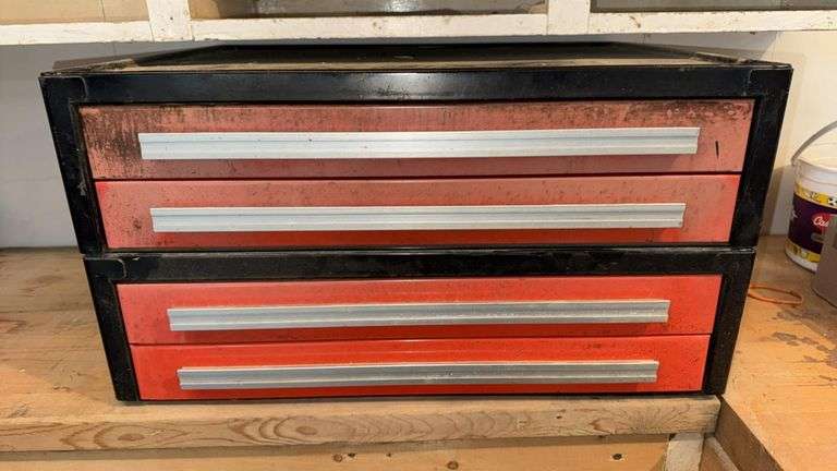 Metal Tool Chest with 3 Drawers, Red and Black, featuring miscellaneous hand tools, fasteners, and more, Dimensions: Approx. 26" x 12" x 18" (66 cm x 30 cm x 46 cm), Weight: Approx. 50 lbs (22.7 kg).